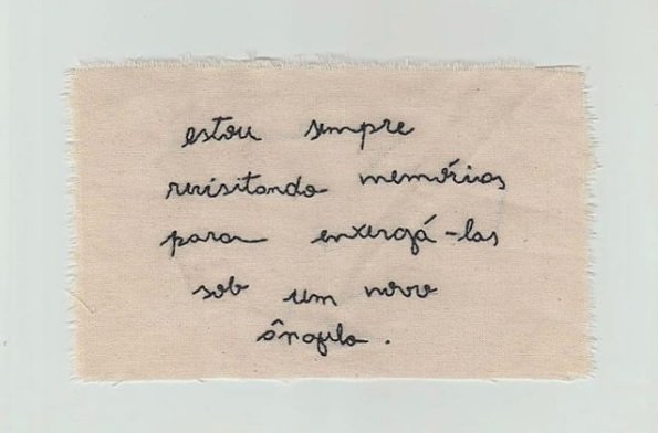 O bordado “estou sempre revisitando memórias para enxergá-las sob um novo ângulo” integra a série de três bordados com trechos retirados do texto escrito por Louise Nunes (@louisennz), mulher preta, 24 anos, brasiliense. A série teve início como um estudo de bordado de palavras e como um exercício de comunicar o que não conseguia ser dito. E assim, através da sensibilidade das palavras de Louise consegui expressar por meio de linha e tecido o que flutuava em minha mente há meses, comunicando antigos anseios e esperanças futuras. O texto completo original está disponível em @louisennz no Instagram.