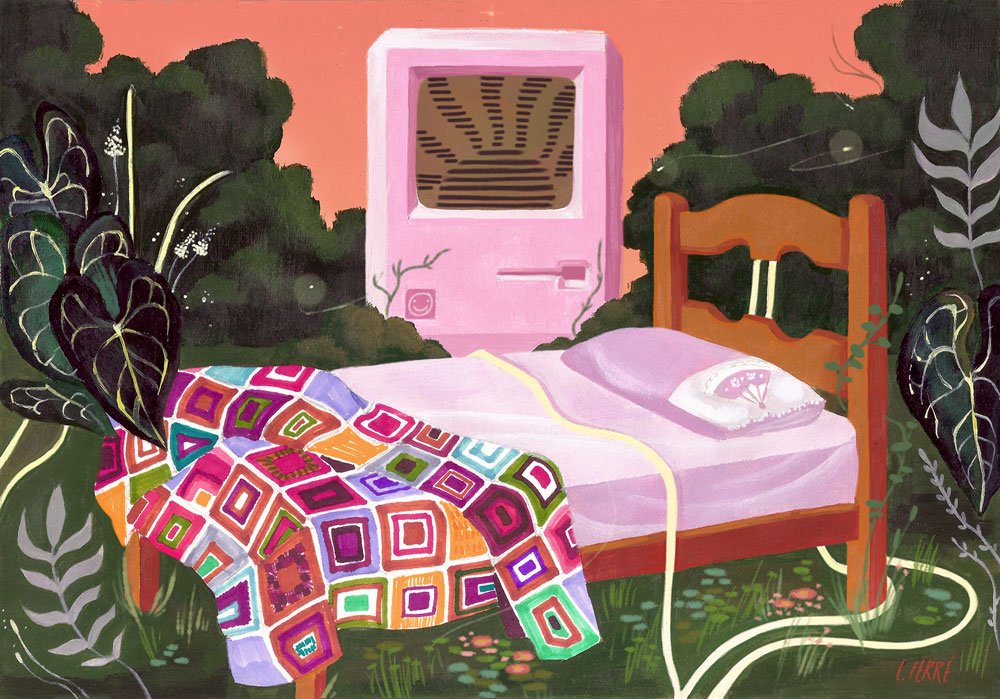 O isolamento social causou, dentre inúmeras transformações, a mudança na forma como interagimos com o espaço. A quarentena restringiu o mundo a apenas alguns metros quadrados e nosso quarto, antes parte quase inexpressiva, passou a representar todo o universo conhecido. Nesse sentido, a obra busca representar a ressignificação desse espaço, a forma como objetos banais assumiram um papel de importância nesse novo contexto, como o brilho do computador que substitui a luz do sol pela manhã. Por outro lado, a obra também retrata a vontade de estar fora, em algum lugar outro que não restrito por quatro paredes, sendo, portanto, o retrato de um desejo quase infantil de acordar e sentir os pés na grama.