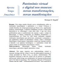 Patrimônio virtual e digital nos museus Voltar abril 23, 2024 by admin   Metadados Miniatura Compartilhe AutoriaMonique Batista MagaldiTítuloPatrimônio virtual e digital nos museusAno2015Tipo de publicaçãoArtigoResumo ou sinopseO artigo propõe discutir novos entendimentos sobre as instituições museológicas, o patrimônio e o virtual.Referência (ABNT)MAGALDI, Monique B. Patimônio virtual e digital nos museus: novas transformações, novas manifestações.Link da publicaçãohttps://www.pr.anpuh.org/resources/download/1483976106_ARQUIVO_Texto10ArtigodeMoniqueMagaldiFinalizado.pdf Continuar navegando O CAMPO DISCIPLINAR DA MUSEOLOGIA: AS DIFERENTES DEFINIÇÕES DE MUSEUS ELETRÔNICOS E A SUA RELAÇÃO COM O VIRTUAL Cibermuseologia: as diferentes definições de museus eletrônicos e a sua relação com o virtual. Voltar para a lista de itens